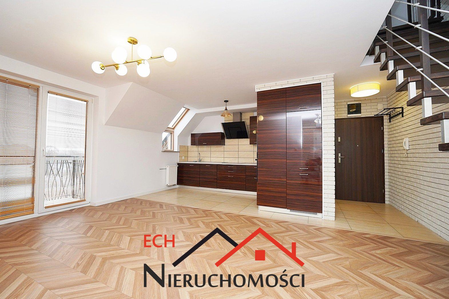 Na dolnym poziomie znajduje się jasny salon z wyjściem na balkon, otwarta kuchnia, sypialnia oraz łazienka z WC.