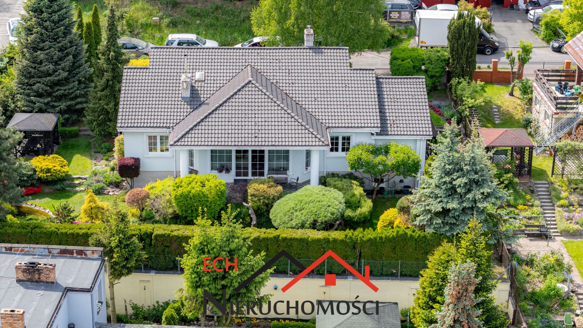 Działka, na której stoi dom o pow. 898 m kw. jest przepięknie zagospodarowana licznymi nasadzeniami (m.in. klon złocisty, czerwonolistny, rododendrony, azalie, hortensje), z oczkiem wodnym z kaskadą oraz z wiatą ogrodową do wypoczynku.