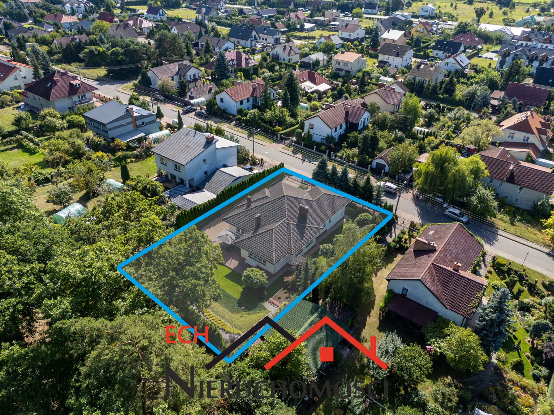 Działka, na której stoi dom o pow. 1235 m kw. jest przepięknie zagospodarowana licznymi nasadzeniami. Stoi na niej również garaż wolnostojący 18,5 m2, z pomieszczeniem gospodarczym nad garażem oraz drewutnią. Całość powierzchni użytkowej kompleksu garażu to 44,10m2.