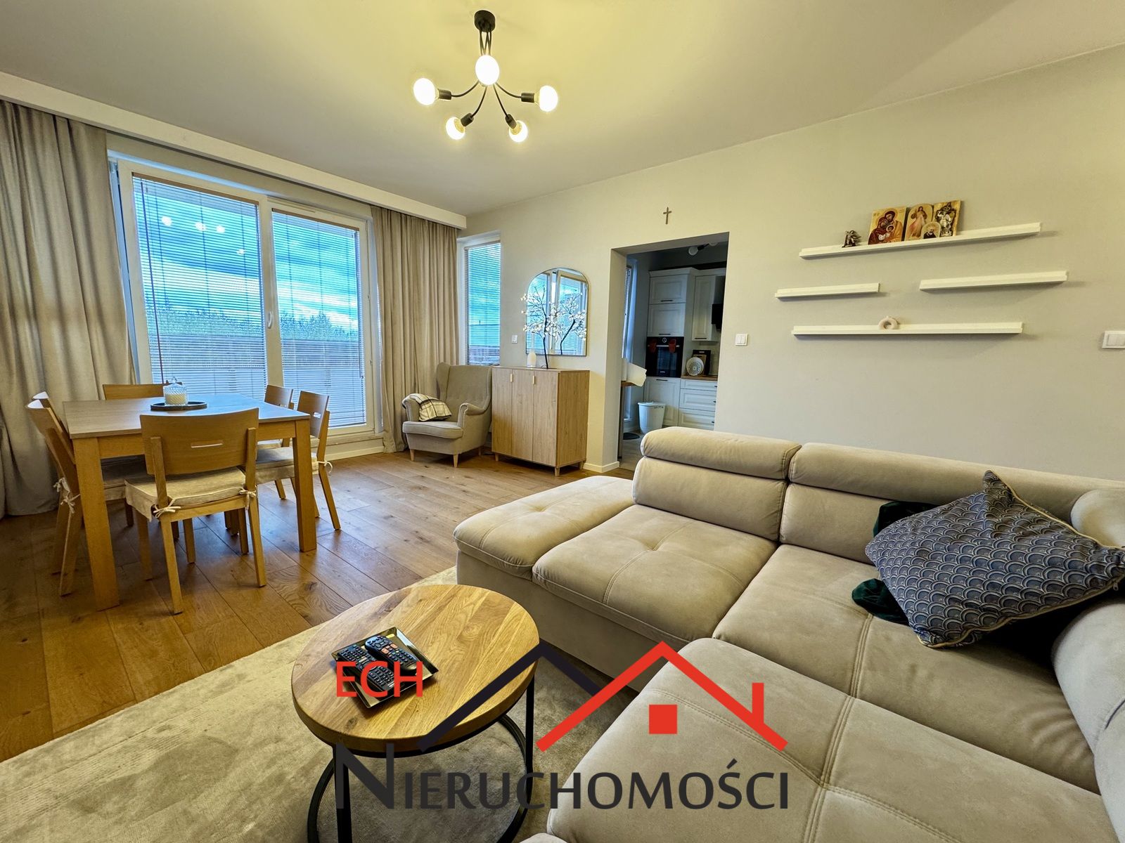 Przestronny salon z aneksem kuchennym i wydzieloną strefą jadalnianą,