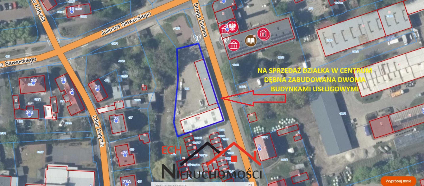 Na sprzedaż nieruchomość gruntowa zabudowana dwoma budynkami magazynowo - usługowymi w m. Dębno przy ulicy Droga Zielona 2.