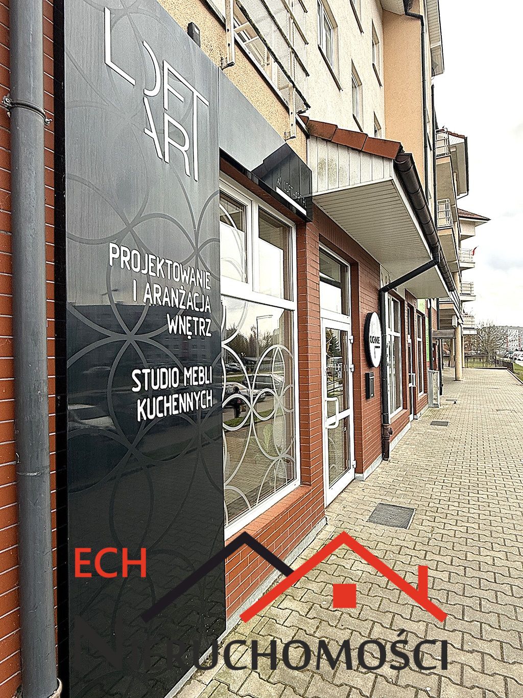 Lokal posiada duże przeszklone witryny, balkon oraz wejście z poziomu chodnika.