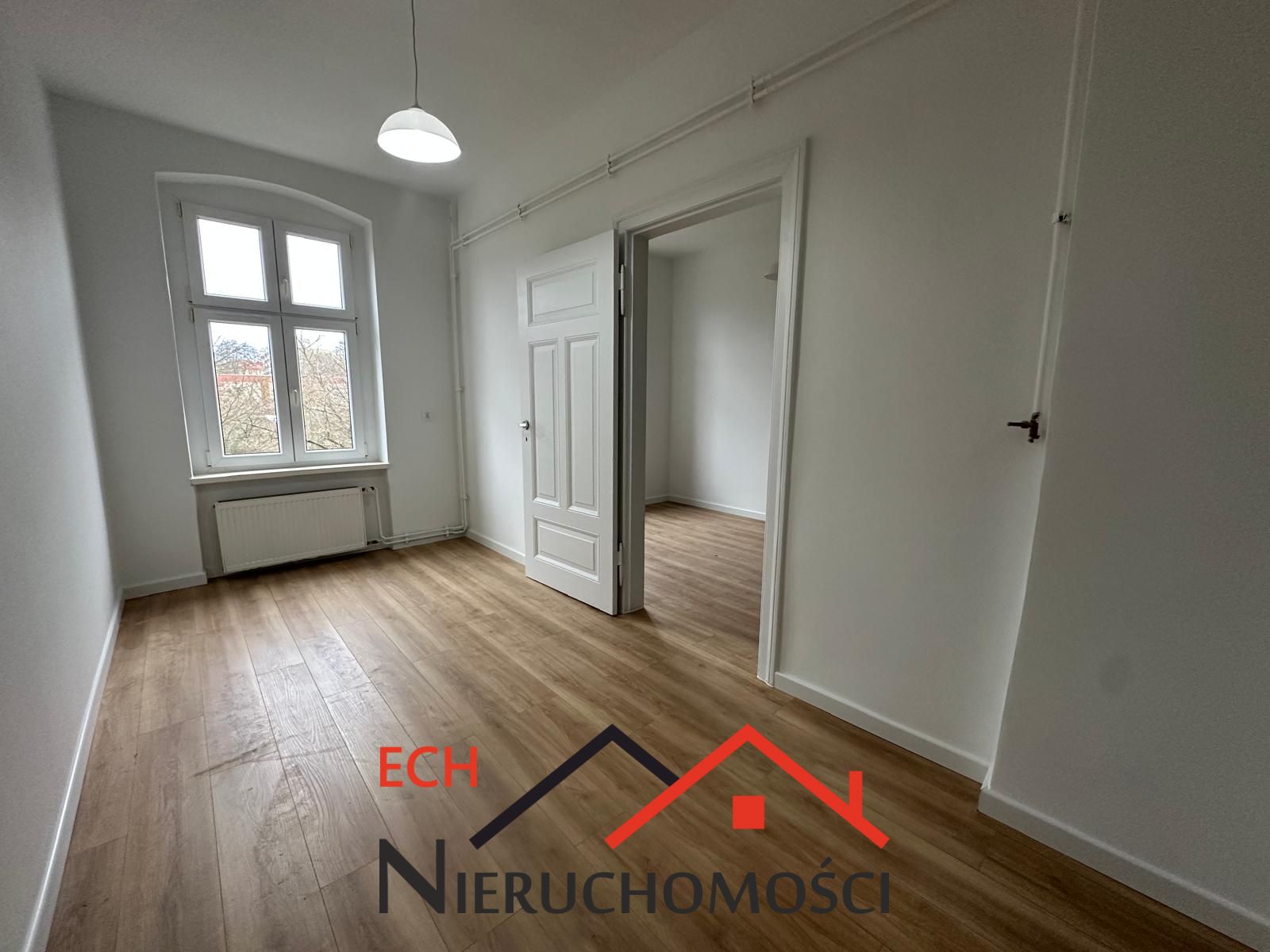 Ściany malowane na biało, nowe panele podłogowe.
